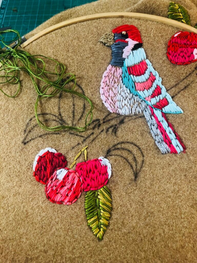 La broderie est ensuite élaborée entièrement à la main, point après point. Ce travail minutieux demande patience, précision et sens du détail. Les fils sont sélectionnés avec soin pour leur qualité et leur rendu, afin de créer des textures, des reliefs et des nuances uniques. Aucun geste n’est laissé au hasard : chaque point contribue à l’équilibre et à l’âme de la pièce.