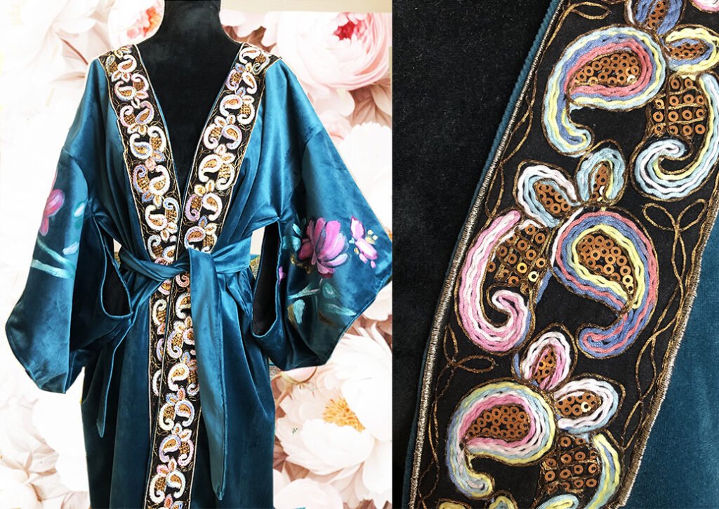 Découvrez une pièce d’exception : ce somptueux kimono en velours lisse vert émeraude, à la fois profond et lumineux, capte immédiatement le regard par son élégance rare. Il est sublimé par un riche galon vintage indien, délicatement choisi pour apporter une touche d’authenticité et de caractère.