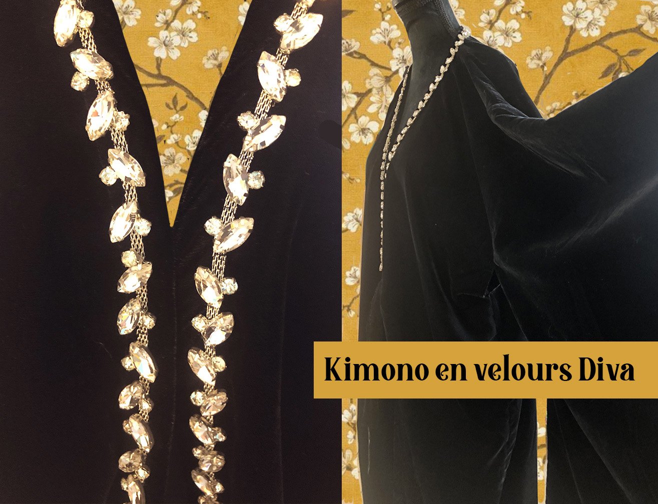 Ce kimono d’un noir profond, taillé dans un velours de soie somptueux qui capte la lumière à chaque mouvement, révèle des reflets subtils et sensuels. La matière, dense et fluide à la fois, épouse le corps sans jamais l’emprisonner, créant une silhouette à la fois mystérieuse et majestueuse.